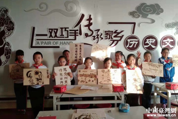 汉沽中心小学烙画社团的百余位同学们在葫芦、刻板上创作作品。(图片来源:天津市台办)