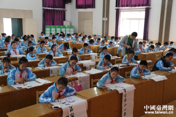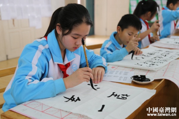 塘沽中心庄小学200名书法小选手现场竞技,用笔墨向海峡传递着浓浓的情怀。(图片来源:天津市台办)
