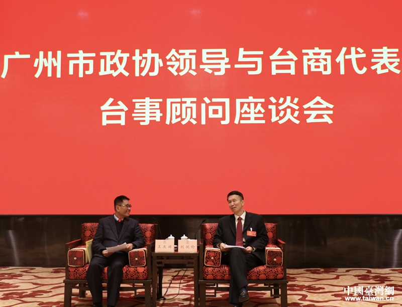 中国台湾网1月18日广州讯 1月14日上午,广州市政协十三届三次会议在白云国际会议中心开幕。开幕会后,市政协主席刘悦伦与市台商代表、市政协台事顾问进行了座谈。市政协副主席李瑾、秘书长黄洁峰及市委台办主任曾卫东、市政协港澳台侨外事委员会主任李瑜等参加了座谈会。列席市政协十三届三次会议的广州市荣誉市民、广州台协会长王庆祥,荣誉会长王治中等20名台商代表及台事顾问出席了会议。