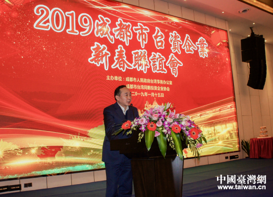 中国台湾网1月18日成都讯 2019年1月16日,2019成都市台资企业新春联谊会举行。省市有关部门负责人与在蓉台商共计550余人欢聚一堂,喜迎新春。四川省台办主任罗治平、成都市委常委吴凯、成都市台协会长徐大伟出席并致辞,成都市台办主任戴浚主持联谊会。
