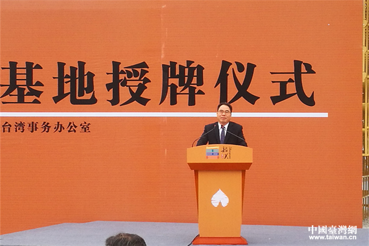 国台办交流局局长黄文涛向韶关市颁授海峡两岸交流基地牌匾。(图片来源:广东台办)