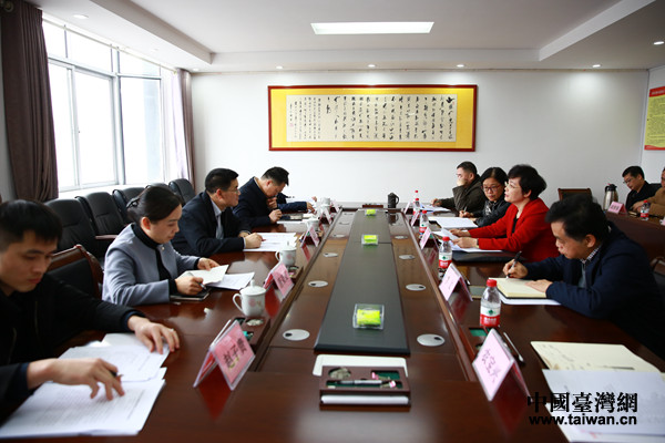 广西台办主任李东兴(前右2)作工作汇报。(图片来源:广西台办)