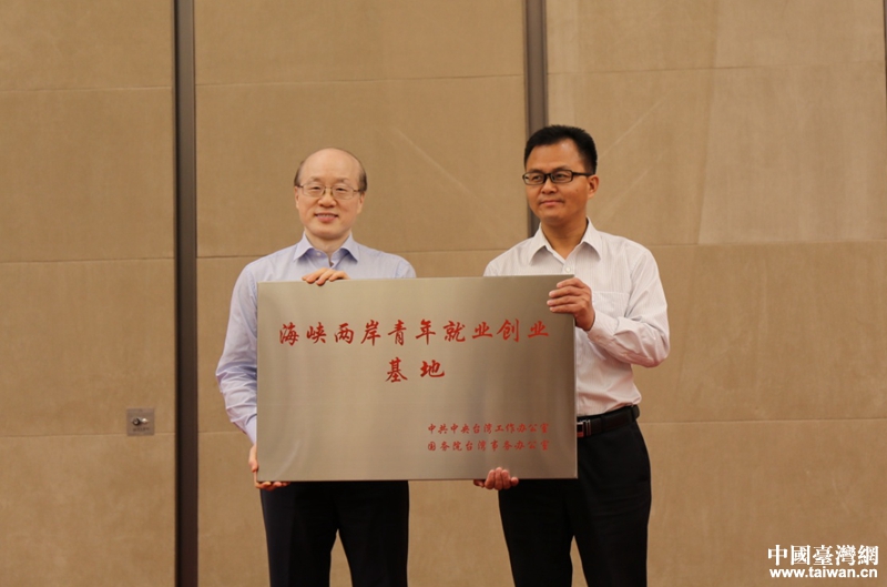 国台办主任刘结一向亚台青海峡青年创业园授牌国家级“海峡两岸青年创新创业基地”。(图片来源:四川省台办)