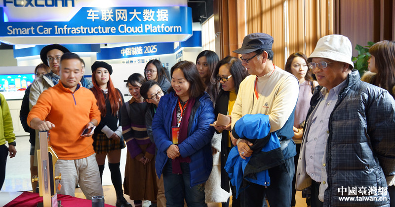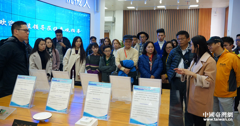 富士康南宁科技园工作人员向台湾嘉宾介绍开发的智能产品。(图片来源:广西南宁市台办)