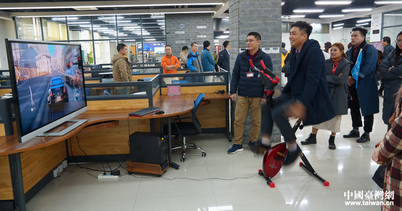 台湾嘉宾体验“GAME-BIKE智能健身”系统。(图片来源:广西南宁市台办)