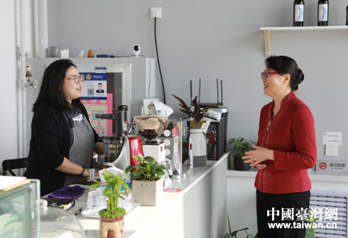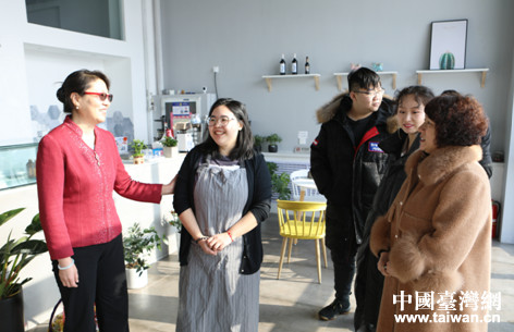 台胞潘姵蓉和新疆塔城小伙夏斌通过网络相识相爱,现在组建了自己的小家庭,小两口在乌鲁木齐市经营一家西点甜品店。阎梅主任一行来到他们的小店,详细询问了日常经营情况,同时向来疆创业发展的台湾青年表示赞扬,并介绍了相关政策。鼓励小两口在疆发展信心,希望踏实工作,加倍努力,争取扩大经营。潘姵蓉表示,自己是学习烘焙专业的,手工制作是她的最爱,来乌鲁木齐市居住后,就开启了线上手工蛋糕销售,客户还挺多,经常都忙不过来,去年又开了这家西点甜品实体店,认识了很多新疆朋友,大家对她都非常友善,让她感受到了新疆的热情,也让她一个远嫁到新疆的台湾女孩非常感动和欣慰。她称,自己也非常喜欢新疆的气候和饮食,常常向岛内的亲朋好友介绍新疆,邀请他们来疆走走看看,了解认知新疆。今后会积极参与台办举办的各类活动,继续脚踏实地努力工作,争取更大发展。