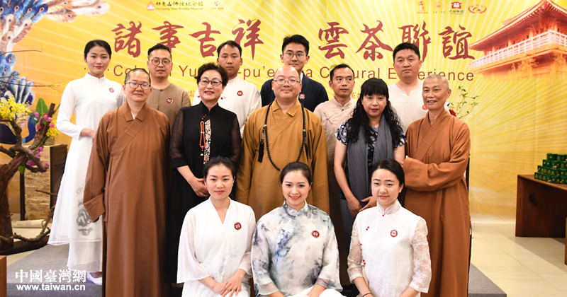 佛光山住持心保和尚(第二排右三)和佛陀纪念馆如常馆长(第二排左一)出席奉茶会。(图片来源:云南省台办宣传处)