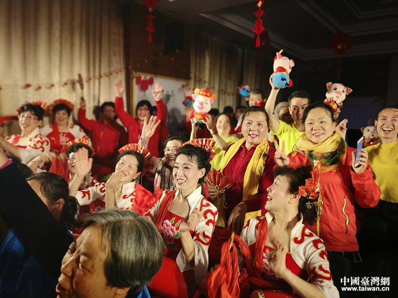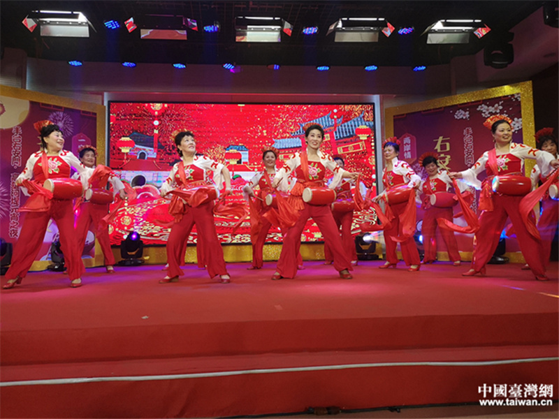 喜庆的腰鼓舞《张灯结彩》,热热闹闹地拉开了两地社区居民“以舞会友”的互动序幕。(中国台湾网 郜利敏 摄)