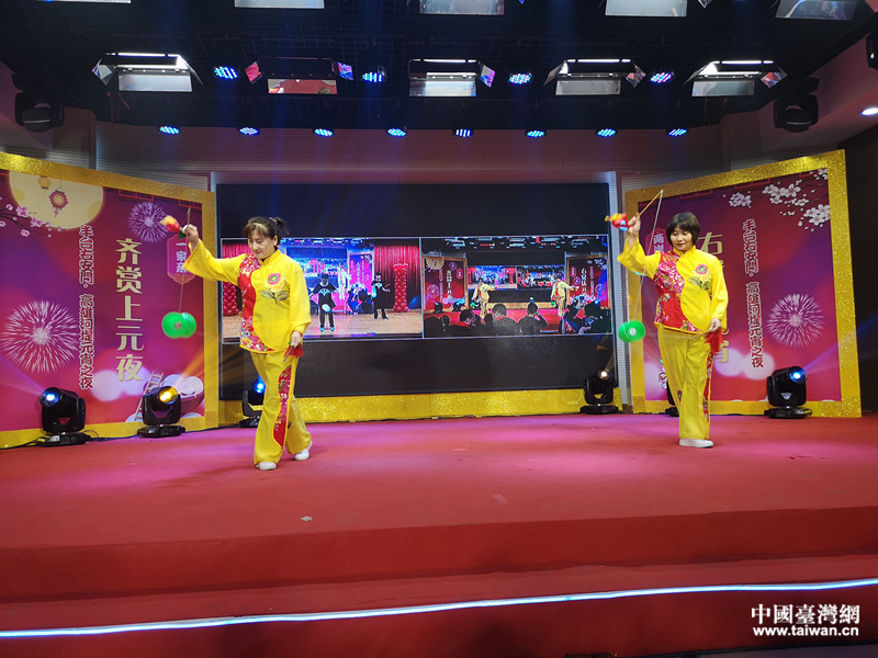 抖空竹节目在京台两地社区活动现场同时上演。左侧屏幕上是高雄三民区的台湾青年们表演抖空竹。(中国台湾网 郜利敏 摄)
