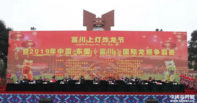 中国台湾网2月20日贺州讯 2月14日,2019年中国·东盟(富川)国际龙狮争霸赛开赛仪式在广西贺州市富川瑶族自治县举行,台湾龙狮团运动协会前来参加“高桩南狮”项目,与香港、澳门、缅甸、泰国、马来西亚等10多支队伍同场献艺。