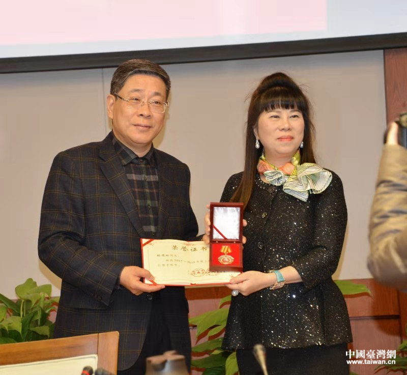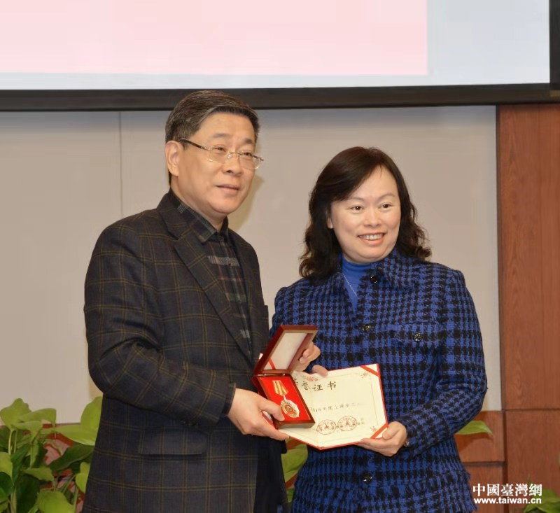 上海市台办主任李文辉为获得2017-2018年度上海市三八红旗手的台胞颁发荣誉证书。(图片来源:上海市台办)