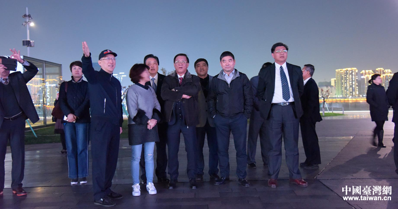 观看南投风光片钱江新城灯光秀。(图片来源:杭州市台办)