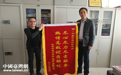 凯普松电子科技(包头)有限公司总经理林鸿儒(左,台湾籍)向自治区台办赠送锦旗。(图片来源:内蒙古自治区台办)