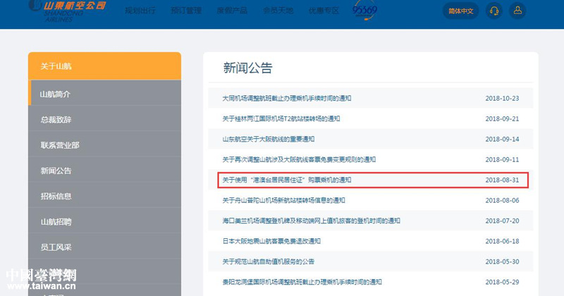 山航通过官网等平台向社会公众告知惠台政策和有关规定。(图片来源:山东省台港澳办)