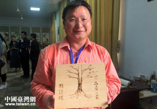 台湾指传媒的游胜钧社长展示烙画成果。(图片来源:河南省台办)