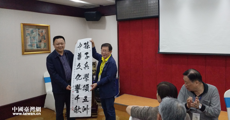 中华文化孙子兵法研究学会会长杨学仁(右)向长沙县委副主任李勇赠送书法作品。(图片来源:长沙台办)