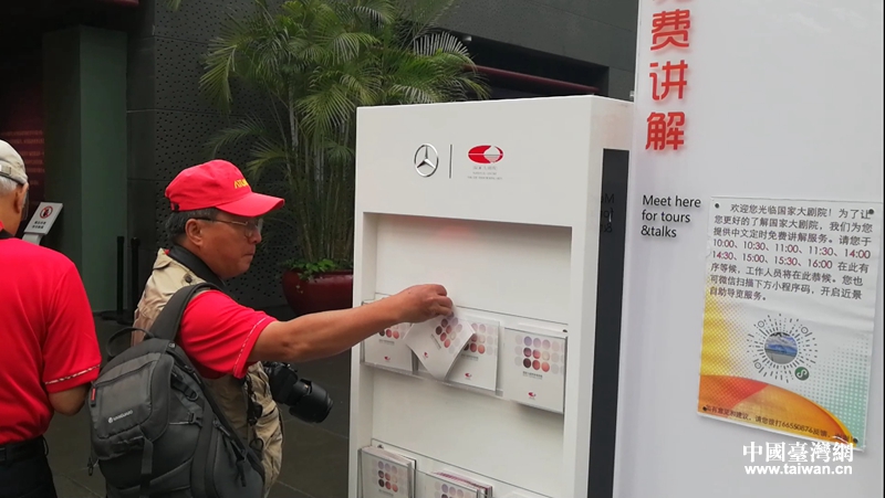 国家大剧院内,参访团成员观看讲解图册。(中国台湾网 张露露 摄)