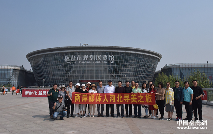 “寻美之旅——两岸媒体河北巡礼”新闻交流活动日前举办。两岸媒体人在唐山市规划展览馆前合影。(来源:河北省台办)