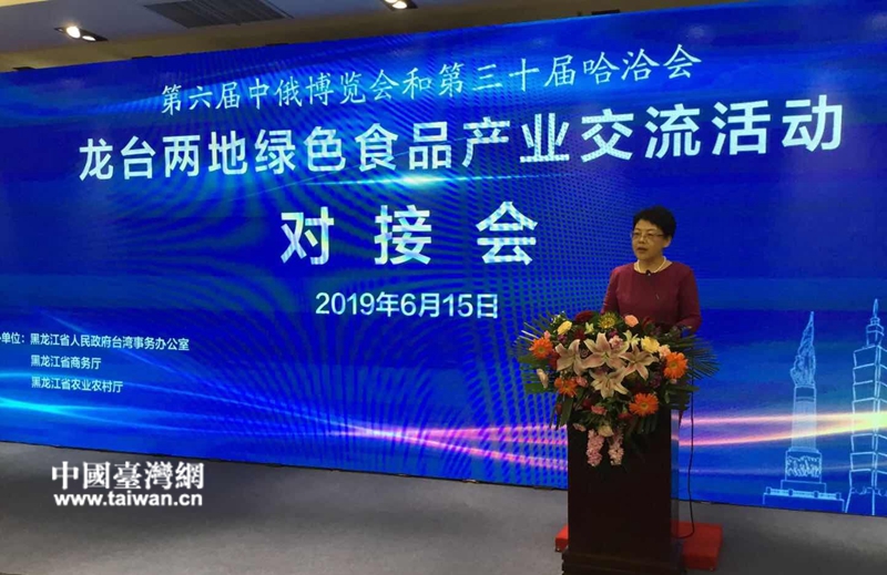 黑龙江省商务厅副厅长王平、黑龙江省农业农村厅副厅长孙化库、哈尔滨市松北区副区长郭启才分别就黑龙江省经济社会发展情况、该省优势农业及绿色食品发展情况、以及哈尔滨新区有关情况进行了介绍和推介。台湾中华青年企业家协会荣誉总会长刘灿树、台东县中小企业家协会理事长罗永昌在会上发言。刘灿树说,“台湾中华青年企业家协会近年来多次来黑龙江考察,对宝泰隆集团的石墨稀项目、在七台河生产高粱酒项目、以及与牡丹江台湾农民创业园的合作等都进行了深入的考察和洽谈,希望这次对接会能够结出更多的合作果实”。罗永昌说,“台东县生态优良,农业产业发展较好,与黑龙江发展绿色农业和旅游观光产业高度契合,希望通过此次对接会,促进双方进一步的交流合作”。