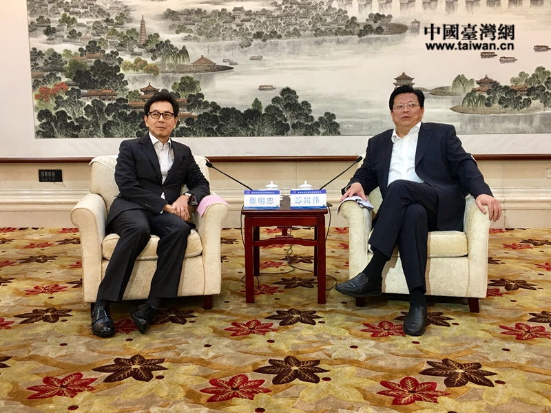 济南市委副书记苏树伟会见了参加两岸新旧动能高峰论坛活动的富邦金融控股集团董事长蔡明忠等部分台湾客人。(图片来源:山东省台办)