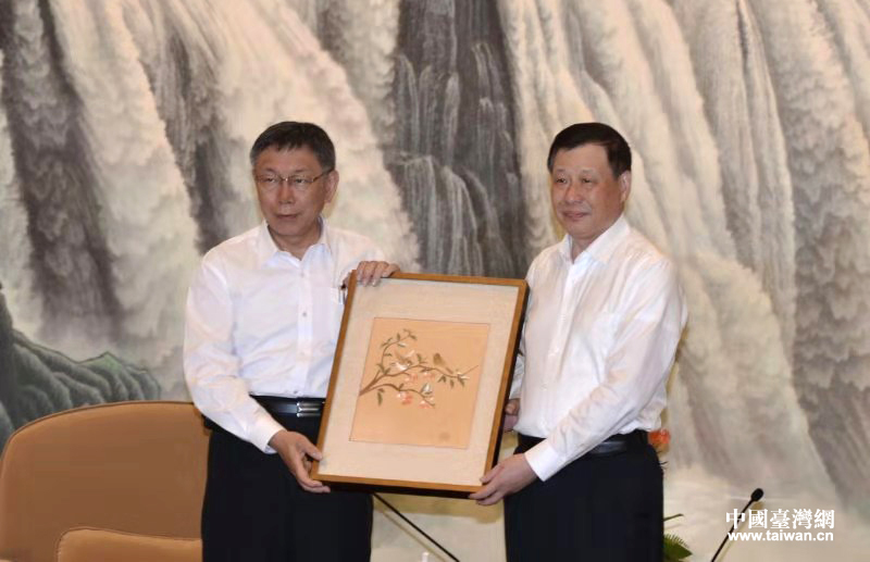 应勇赠送柯文哲市长“双喜如意”的绣品,寓意吉祥。(中国台湾网发)