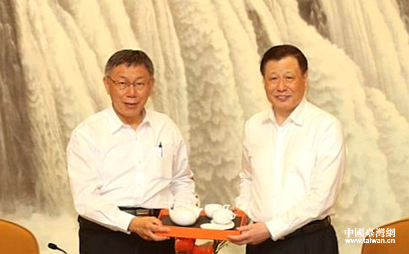 柯文哲回赠了“一心一意”的壶具,象征两人一心同声同调。(中国台湾网发)