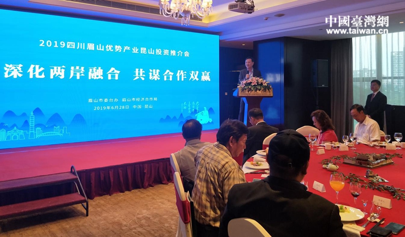 中国台湾网7月23日讯 为进一步加快海峡两岸产业合作区眉山产业园建设,近日,眉山市委台办、市经济合作局在江苏昆山举办“2019四川眉山优势产业昆山投资推介会”。眉山市委常委、副市长李兴乾出席并致辞,台湾区电机电子工业同业公会(简称“电电公会”)副秘书长毛恩洸、昆山台湾同胞投资企业协会常务副会长陈丽梅、副会长陈金镇、吴荣六以及80余名台企负责人出席推介会,眉山市政府副秘书长徐驰主持推介会。