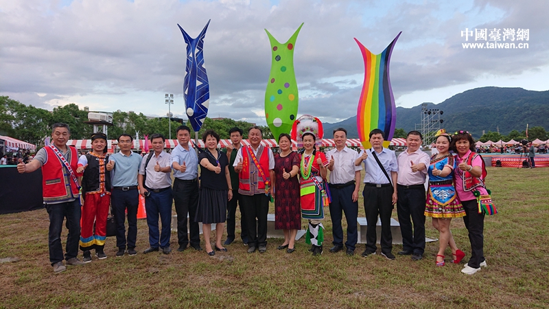 参访团与花莲县县长徐榛蔚,玉里镇镇长蔡秋龙、徐惠玲夫妇一同参加玉里2019年“原舞震璞石,传唱纵谷情”联合庆丰年活动,向玉里民众献上精彩的壮族歌舞和刘三姐的“绣球”,表达对玉里同胞节日的祝福和美好生活的期盼,与玉里民众一起载歌载舞,共同演绎快乐,“两岸一家亲”在歌声中飞扬,在舞步中激荡。