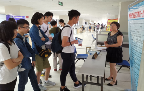 在扬州人才市场听取工作人员介绍招聘流程和有关就业政策 (图片来源:扬州市台办)