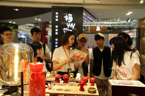 台湾同学在扬州Rmall看到了自己老师设计的一件作品非常兴奋 (图片来源:扬州市台办)
