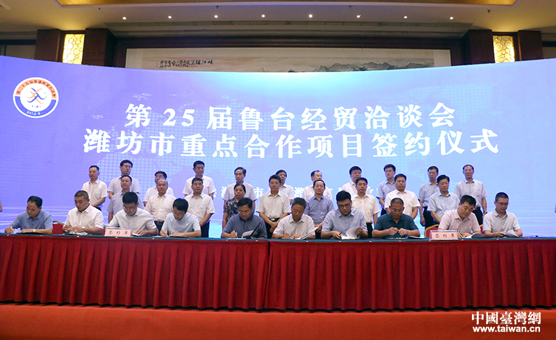 第25届鲁台经贸洽谈会2日下午举行潍坊市重点项目签约仪式,20个项目签约。(中国台湾网 普燕 摄)