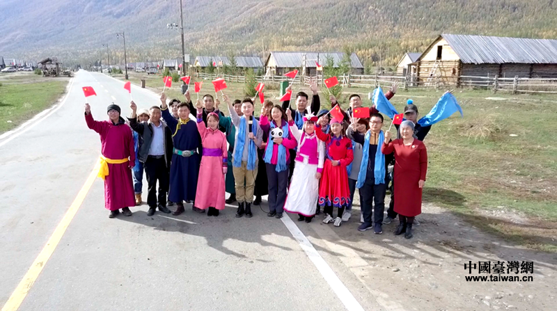两岸青年与当地少数民族朋友一起在新疆哈纳斯村唱响《我和我的祖国》共祝祖国生日(图片来源:新疆台办)