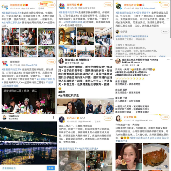 截至10月17日,@微博政务 @微博两岸 @微博古诗词 @微博台湾 @中国台湾网等数十个微博账号以及两岸嘉宾@魏新 @million赵、@化石kiko @Wisely的拍拍照写写字 @水静葳~JING找乐子 @POP!微博 @Miss.2340 等微博、Facebook社交媒体账号持续发布活动贴文,截止发稿时,#跟着诗词走江苏#微博阅读量超2300万次,两岸网友在社交媒体平台以诗词会友,通过诗词找到文化共鸣。