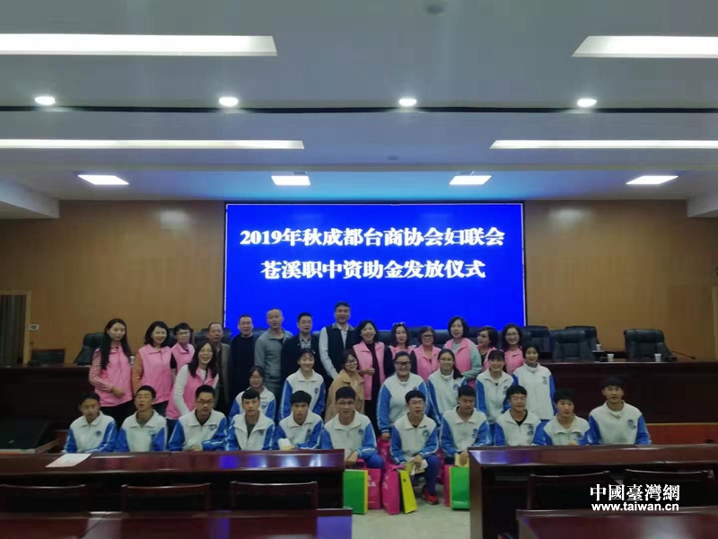 成都台商妇联及爱心企业代表与苍溪职中受助学生合影(图片来源:广元市台办)