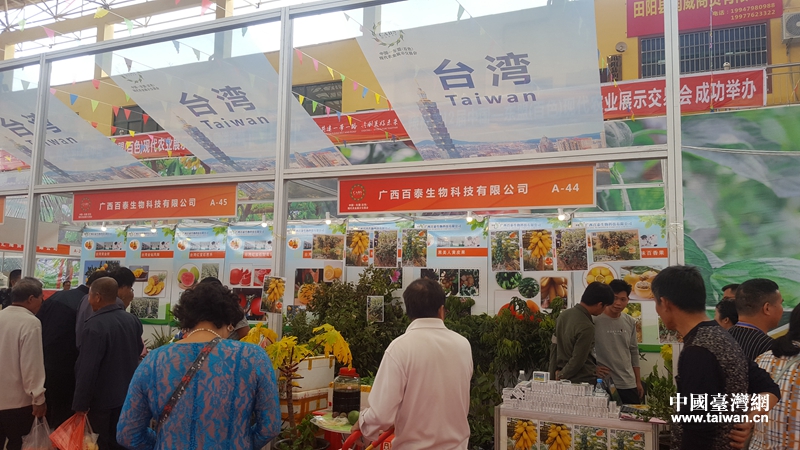 农展会上,台湾黄金柑、金钻凤梨、金甜葡萄柚、黑金刚莲雾、长桑果、凤梨释迦等农产品大放异彩,台湾引种的泰国红宝石青柚更受追捧。广西百泰生物科技有限公司展示的来自台湾主要原料和研发技术的微生物共生菌剂及百泰微生物有机菌肥,具有生物防治病虫害的作用,不仅能够减少对生态的破坏,而且能够提高农产品的安全系数,可以增产增量,前来了解、洽谈的观众络绎不绝。