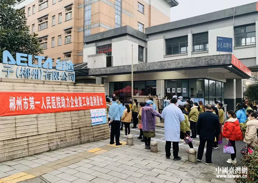 中国台湾网2月13日讯 2月10日,郴州市首家大型台资企业台达电子复产。开工前,郴州市委办公室(市委台办)按照省委对台工作领导小组办公室《关于全力支持和组织推动在湘台资企业复工复产的通知》文件要求,与企业进行专项对接,指导其在全力做好疫情防控工作的前提下,积极筹备复工复产。