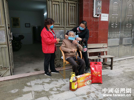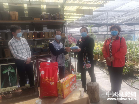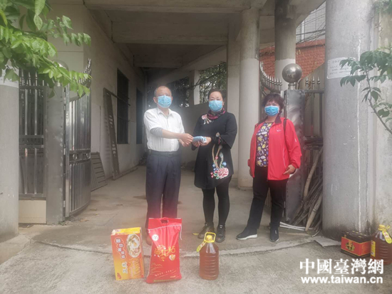 广西玉林市容县台办主任曾汉萍到台胞叶国斌兰花园走访,送上口罩和生活物资。 (中国台湾网 发)