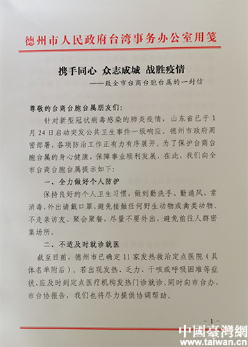 德州市台办向台商台胞台属发出一封信。(图片来源:德州市台办)