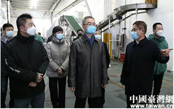 山东省委常委、青岛市委书记、市新型冠状病毒肺炎疫情防控指挥部总指挥王清宪到台资企业青岛顶津食品有限公司走访调研。(图片来源:山东省台港澳办)