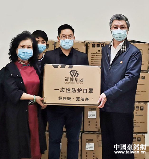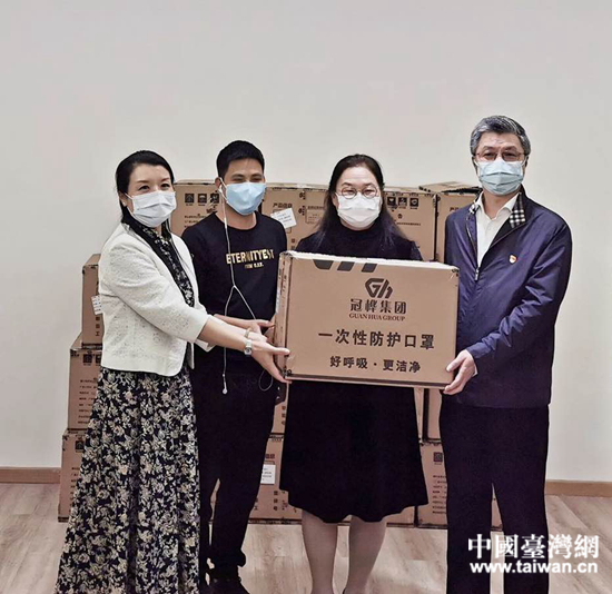 曾卫东向安婕妤公司、最佳女人医疗整形公司两家台企代表赠送防护口罩。 (中国台湾网 发)