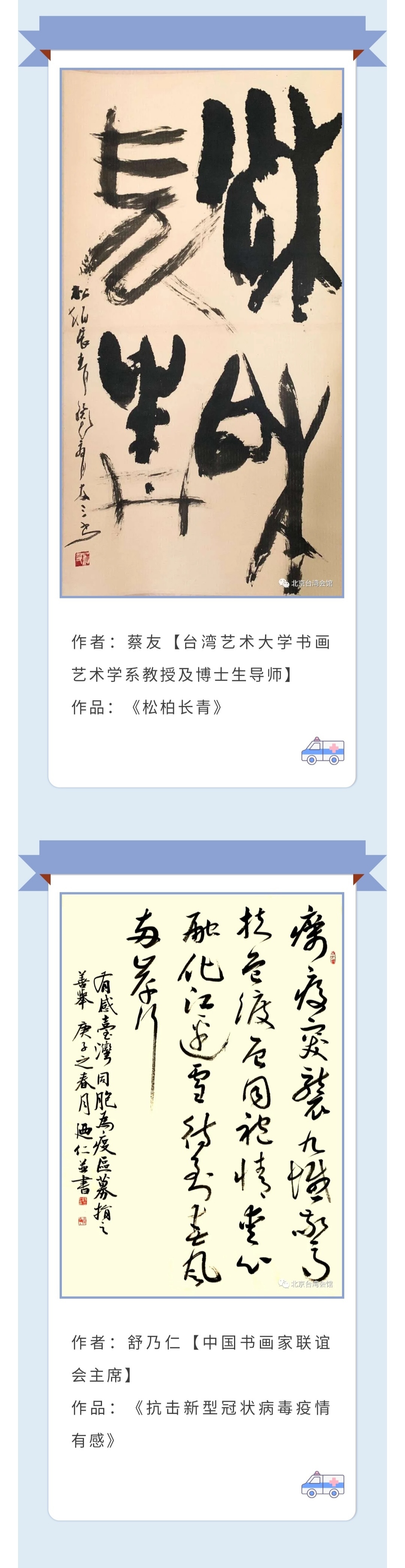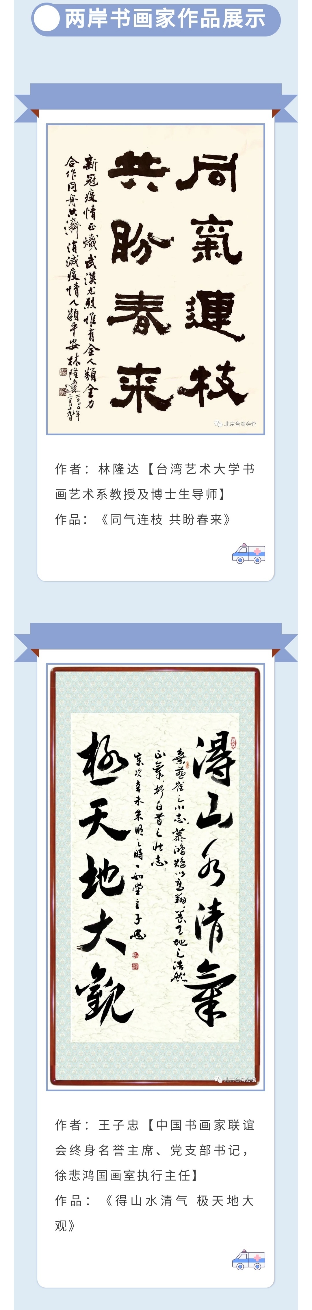这些作品中,有以《同气连枝 共盼春来》《青山一道同云雨 明月何曾是两乡》等为主题的饱含同胞之情、体现血脉相连的书法作品,也有向战斗在一线医务工作者致敬、为伟大中华祈福的书画作品;作品将分为两期,在北京台湾同胞联谊会网站和公众号,北京台湾会馆公众号及中国书画家联谊会微信公众号、官方微博、网站共同展出。(中国台湾网、北京市台联 联合报道)