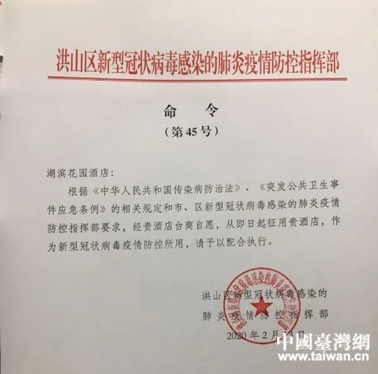 武汉市洪山区防疫指挥部下文,经台商自愿,征用湖滨花园酒店为防疫隔离点。 (中国台湾网 发)