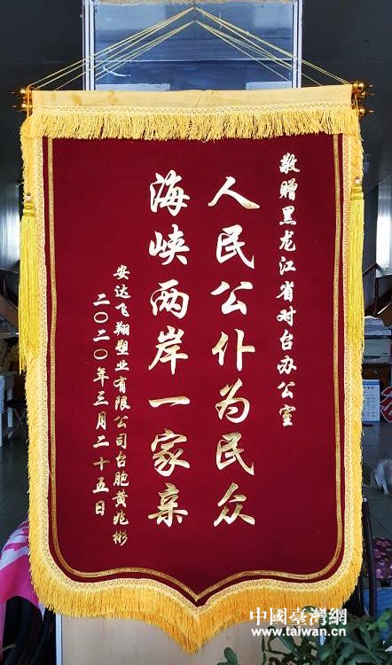 中国台湾网3月29日讯 3月27日,黑龙江省委台办收到安达飞翔塑业有限公司经理台胞黄兆彬先生送来的写着“人民公仆为民众,海峡两岸一家亲”的锦旗。