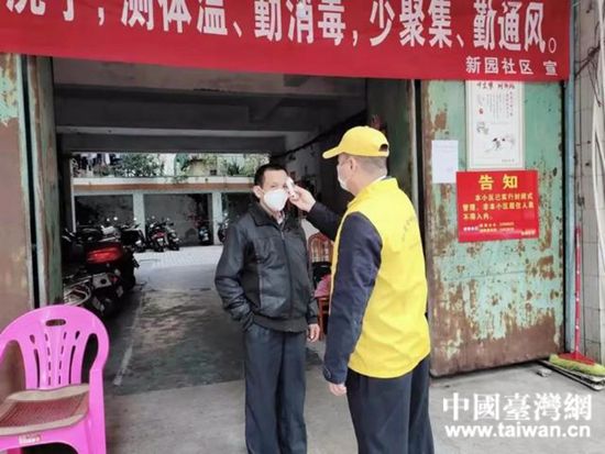 中国台湾网4月8日讯 据广东省台办消息,新冠疫情防控期间,设在广东省汕尾市城区新园等社区执勤检查的岗位上,经常看到一个忙碌的身影,协助对来往人员、车辆进行登记、测量体温、应对咨询等,他就是台湾同胞赖以尊。