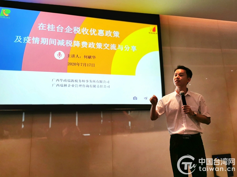 特聘讲师何献华做在桂台企税收优惠政策讲座辅导。(图片来源:广西南宁市台办)