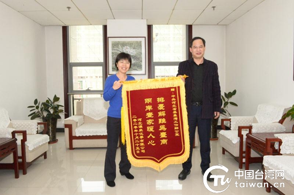 台商吴易达向省委台办台胞服务中心主任苏雪茹赠送锦旗。(河北省委台办供图)