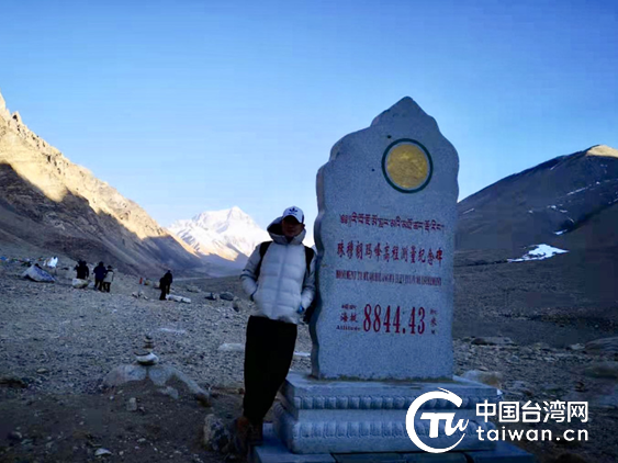 何浩宇与珠穆朗玛峰合影留念。(中国台湾网发)