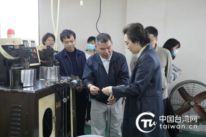 李莉(前一)深入生产车间考察台企广西精记拉链有限公司产品(图片来源:广西台办提供)
