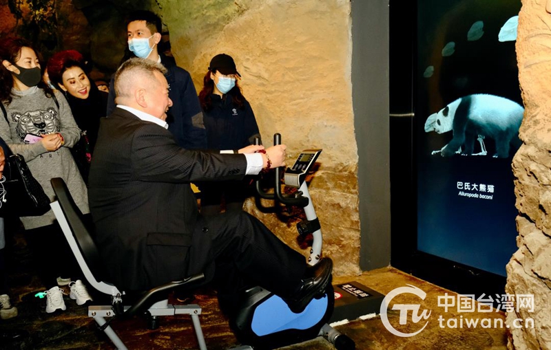 成都台协会会长高锦乐体验踩脚踏车看熊猫演变史。(图片来源:四川省台办)
