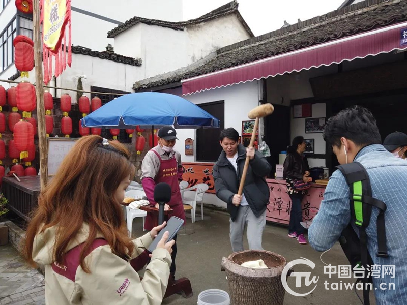 嘉宾现场体验打麻糍(图片来源:杭州市台办)